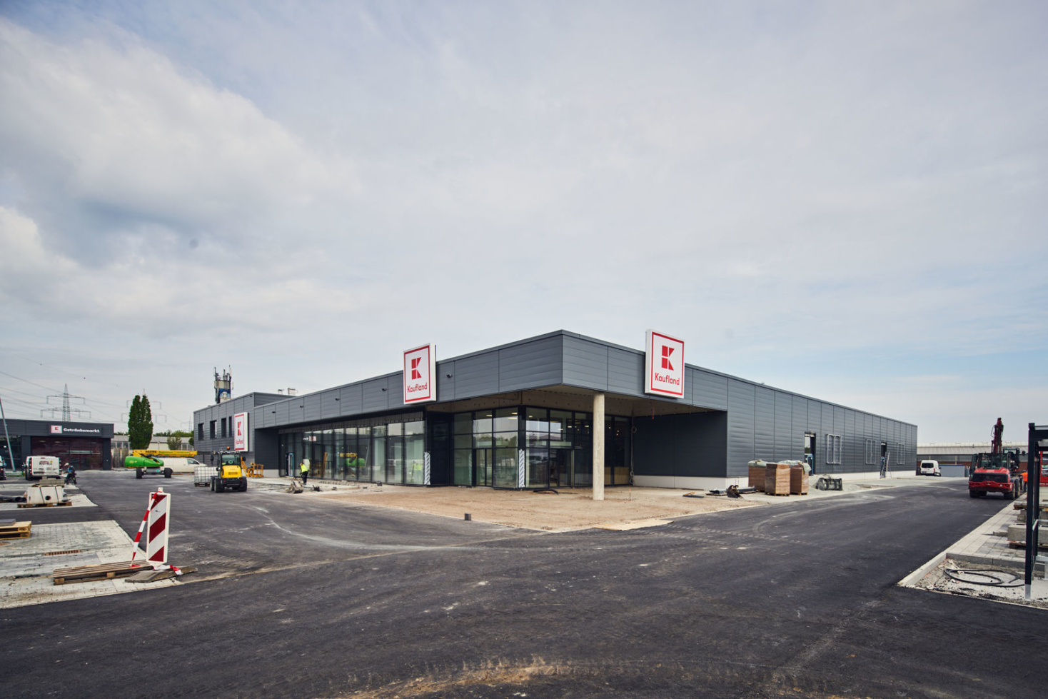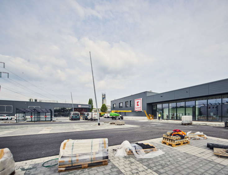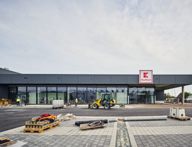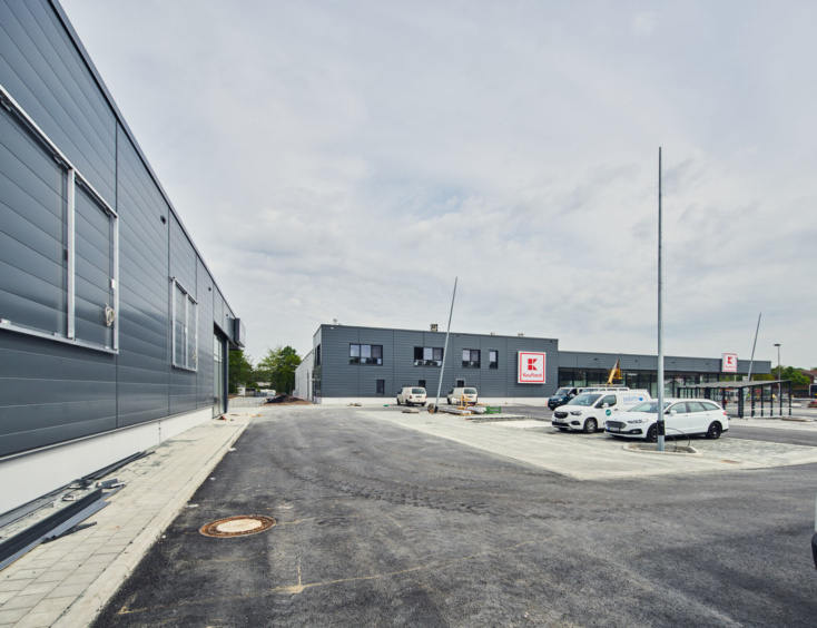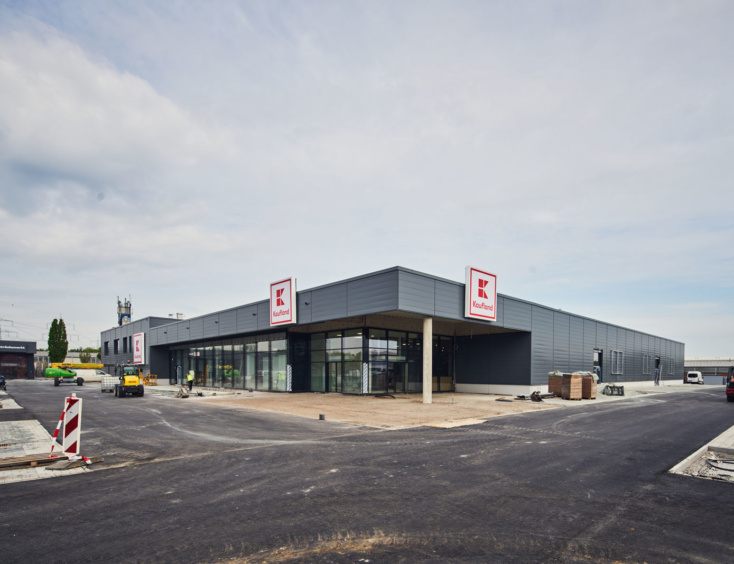 Die Architektur der beiden neuen Märkte orientiert sich an der aktuellen Kaufland-Baubeschreibung, mit einer dynamischen Eingangsspitze und einem Mix aus schlichten Alu-Steckfalz-Paneelen, blankem Sichtbeton und großflächigen Glaselementen.