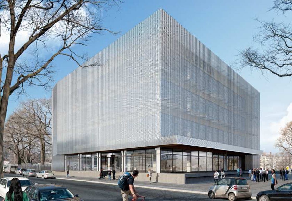 erneuert wird und eine Fassadenverkleidung aus silbrig schillerndem