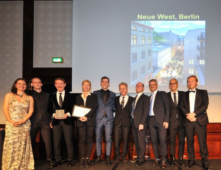 ,,NEUE WEST wurde von der Jury auf Grund der herausragenden konzeptionellen Idee und der gelungenen Aufwertung des Quartiers Potsdamer Straße mit dem Gold Award 2016 in der Kategorie Gewerbe ausgezeichnet. Durch die sehr aufwendige Sanierung wurde mit Sinn und Verstand ein kultureller Ort für Gewerbe und Kunst geschaffen. Durch den Nutzermix und den offenen Innenhof träg NEUE WEST nachhaltig zur Aufwertung der Potsdamer Straße bei und stellt einen markanten Startpunkt zur Wiederbelebung und nachhaltigen Durchmischung des Quartiers dar.“