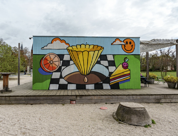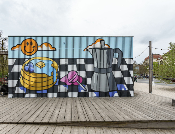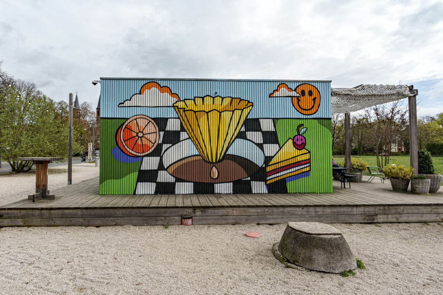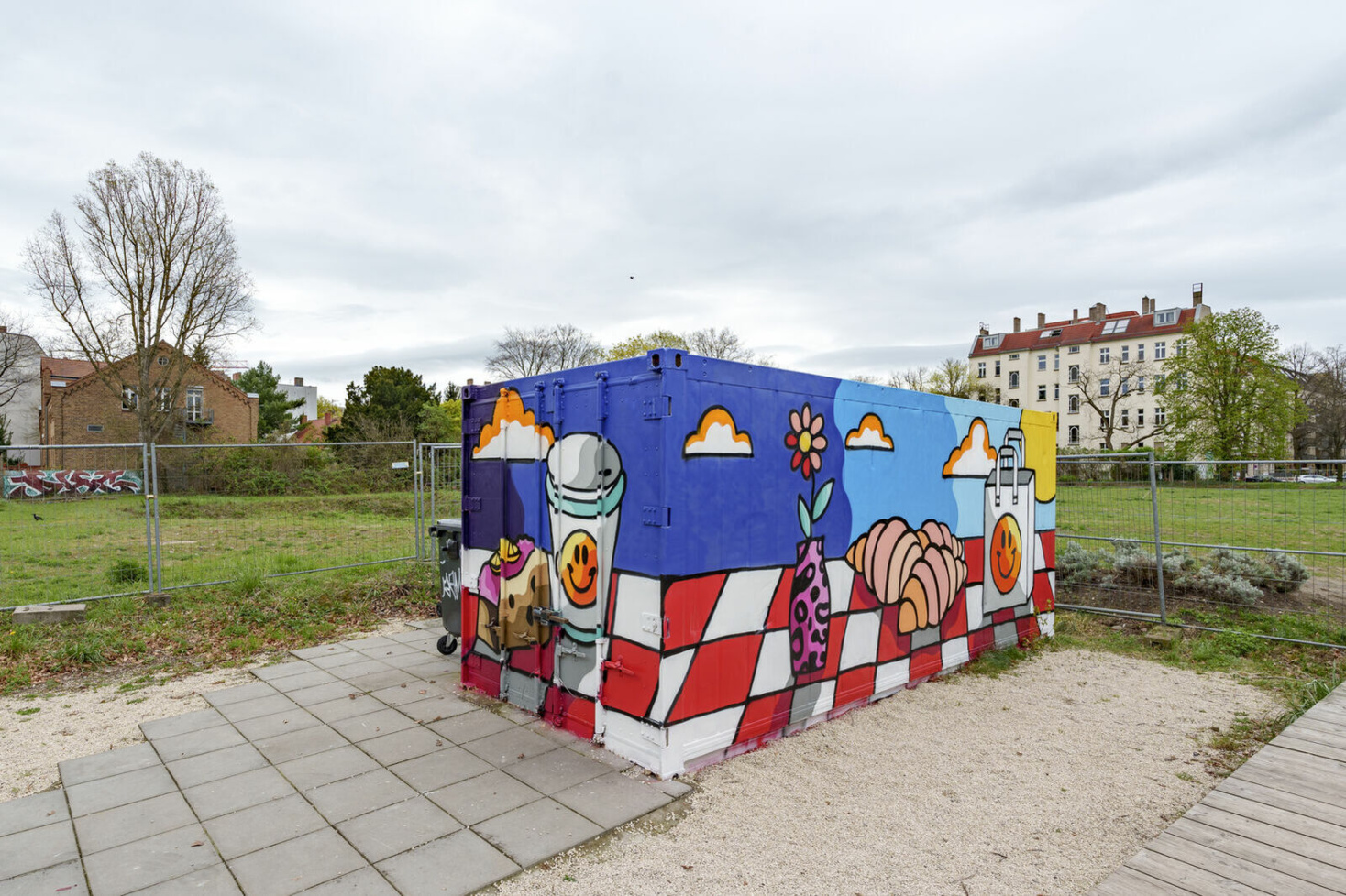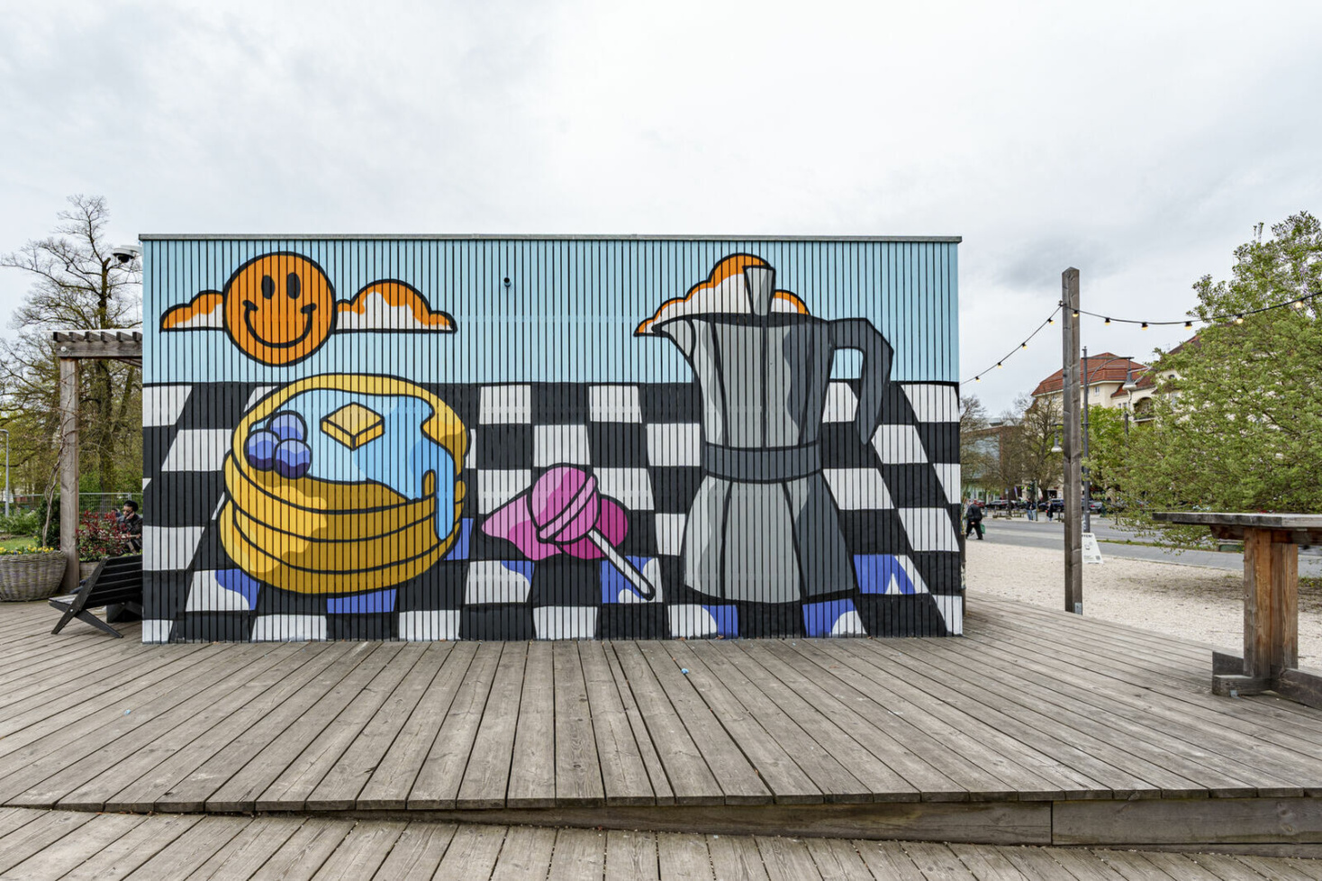 Unser Holzpavillon in Pankow erstrahlt in einem neuen Gewand. Der Prager Künstler Vinny Bonger hat den Pavillon Anfang April in ein wahres Kunstwerk verwandelt. Das Thema des Murals ist ein großes, farbenfrohes Picknick, das sich über den gesamten Pavillon und den beistehenden Container erstreckt. Inhaltlich nimmt das Thema Bezug auf unseren Mieter KIEZ KAFFEE KRAFT. Das Café versorgt seit Jahren sehr erfolgreich die Pankower Nachbarn mit vielen Kaffeeköstlichkeiten und ihrem beliebten Bananenbrot. Vinny Bonger und sein Team haben innerhalb einer Woche mit insgesamt 515 Spraydosen ein buntes und fröhliches Kunstwerk erschaffen. Vinny selber sagt dazu: “Life is made for beautiful moments. I am so grateful for these amazing opportunities to meet people and spread love, joy, and happiness through my artwork.” Da können wir uns nur anschließen!