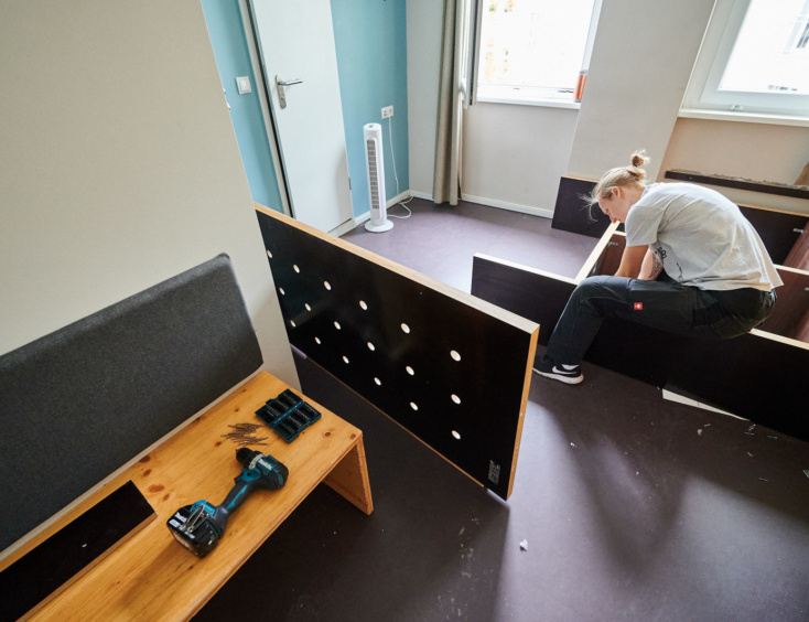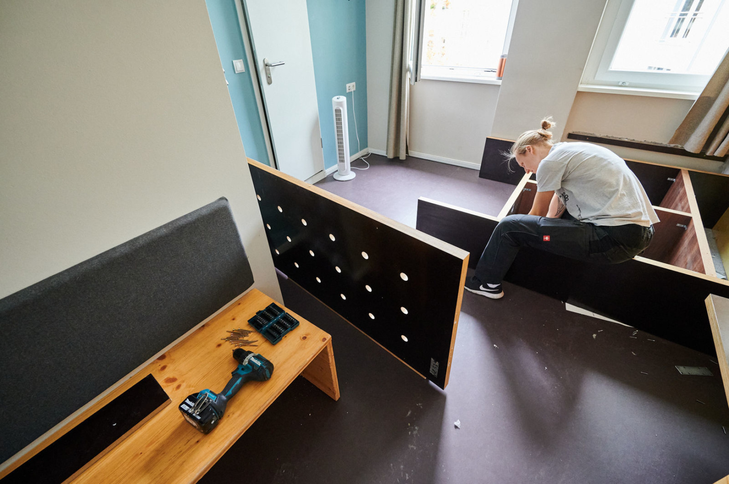 Mit der Material Mafia haben wir eine Partnerin gefunden, der das Recycling von Ressourcen am Herzen liegt. Alle Betten in unserem Hostel waren Einzelanfertigungen aus Holz und Verbundplatten und passgenau in die Zimmer eingebaut. Vieles davon kann nun wieder verwendet werden. Auch Waschbecken, Bettzeug, Leuchten und Schränke werden kostengünstig an soziale Projekte, Jugendeinrichtungen, Schulen und Künstler:innen und andere Kreativschaffende verteilt. Wichtig für die Material Mafia sind Kreisläufe und die Weiterverwendung von industriellen Reststoffen, was wir gern mit Spenden unterstützen.