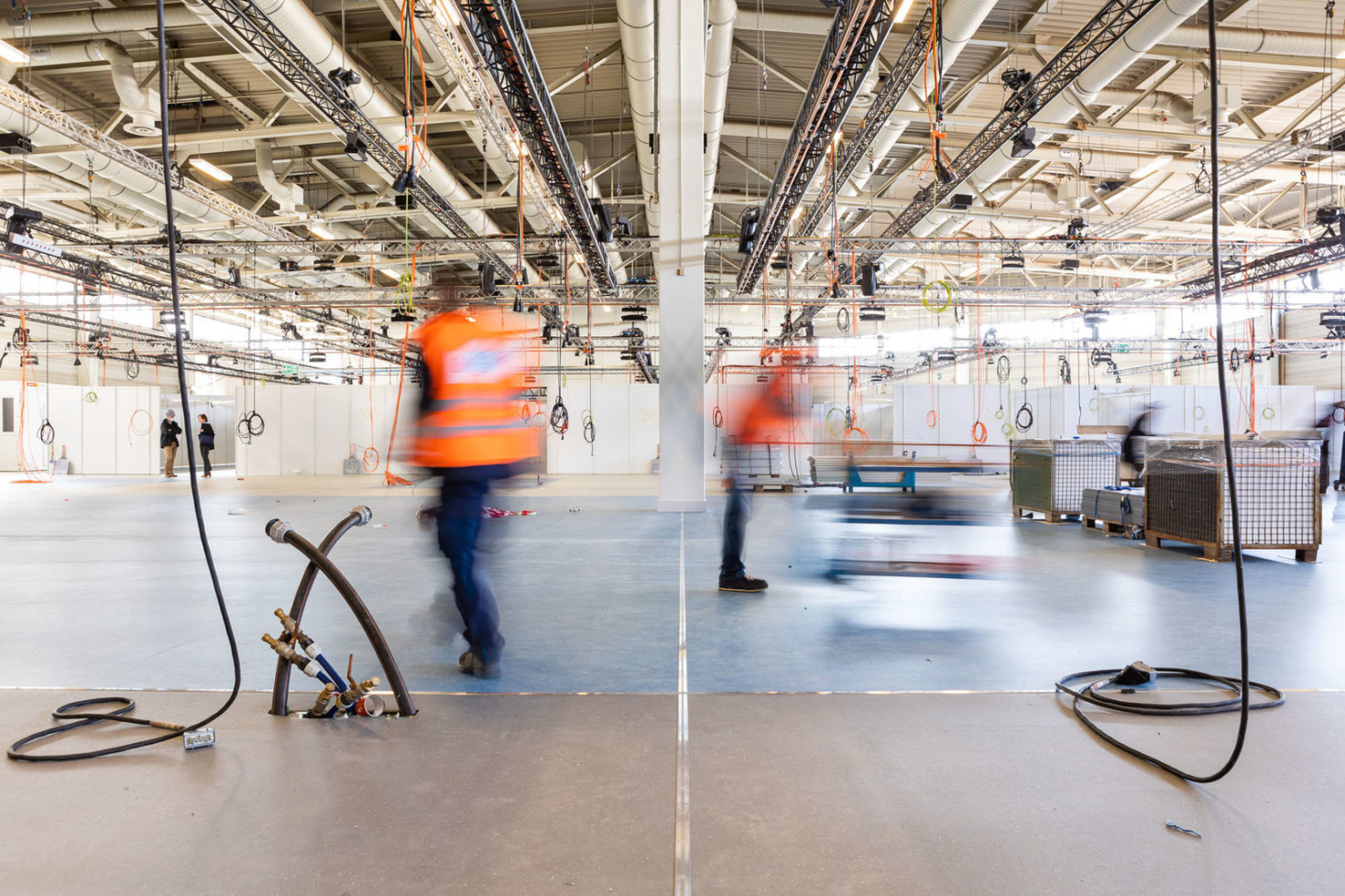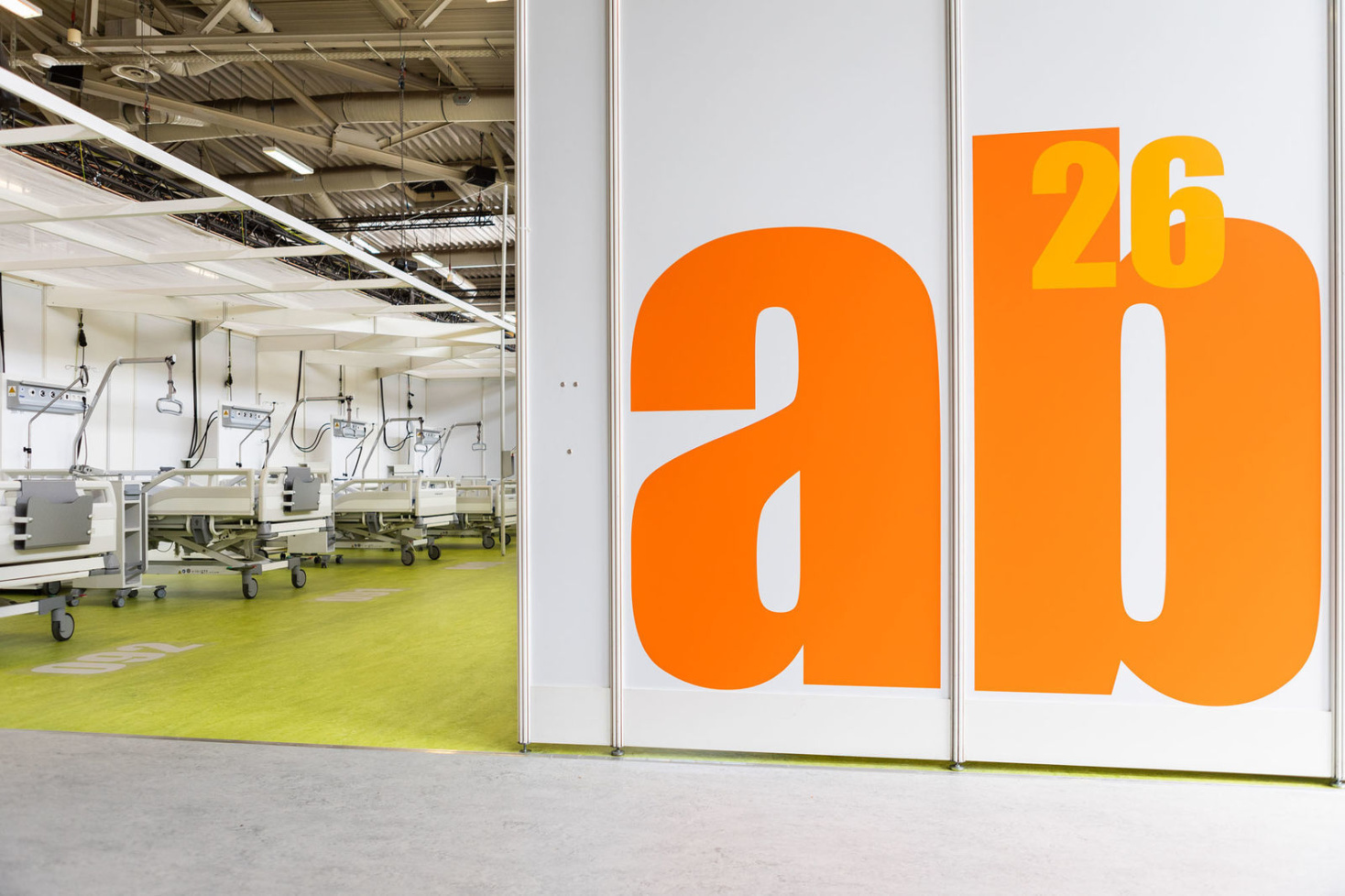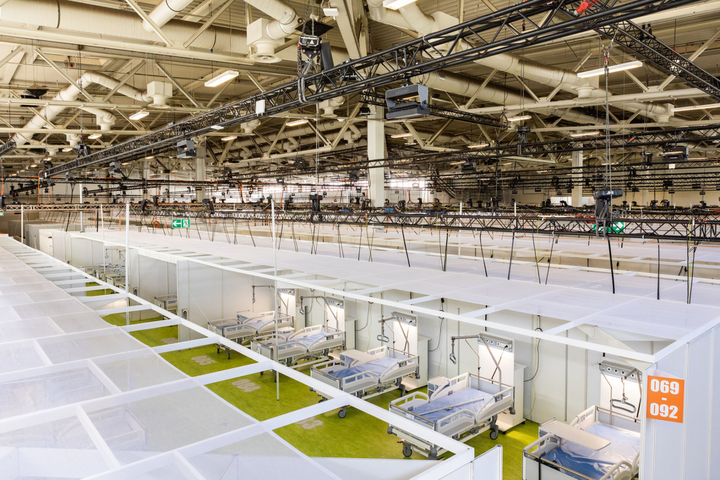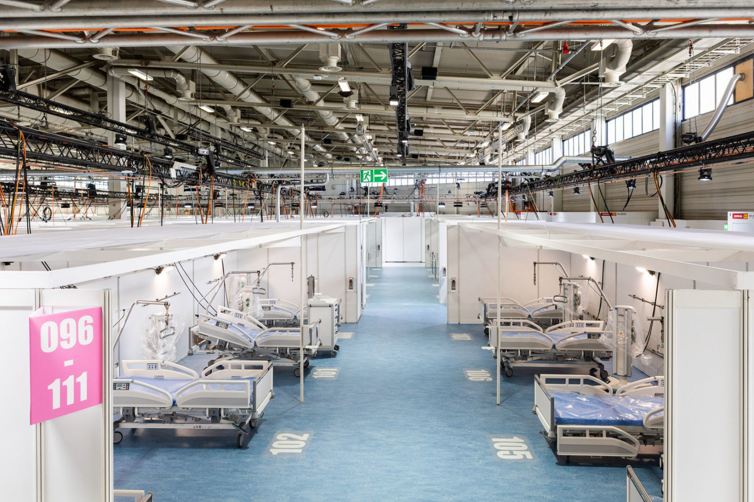 Das Architekturbüro Heinle, Wischer & Partner, Mieter in THE BOX, realisert ein Corona-Behandlungszentrum auf dem Messegelände an der Jafféstraße. In nur vier Wochen wurde in einer der Messehallen ein Reservekrankenhaus mit knapp 500 Bettplätzen errichtet. Die Grundrissstruktur des Corona-Behandlungszentrums basiert auf je nach Pflegeaufwand variablen Clustern mit je 16-24 Betten, sowie einer zentralen Servicezone. Der Vorteil des Cluster-Systems ist, neben seiner Flexibilität, die Adaptierbarkeit für weitere Standorte. Im Fokus des Projektes stand die funktionale Qualität der medizinischen Versorgung, ohne die Bedürfnisse von PatientInnen und MitarbeiterInnen zu vernachlässigen. Es galt – zugunsten des medizinischen Personals – die Vorgaben des Hygienemanagements und Arbeitsschutzes zu garantieren und angemessene Aufenthalts- und Rückzugsräume bereitzustellen. Die für das Corona-Behandlungszentrum eingesetzten Materialien sind zu über 90% weiterverwendbar oder -verwertbar. Dies gilt für das angeschaffte medizinische Mobiliar, welches später in anderen Krankenhäusern Einsatz finden kann, wie für die Messebauwände, Traversen und weiteren Möbel, welche angemietet wurden. Ab Senatsbeschluss vom 17. März 2020 dauerte es nur wenige Wochen, bis das Reservekrankenhaus am 11. Mai 2020 offiziell eingeweiht wurde – und hoffentlich niemals zum Einsatz kommt.