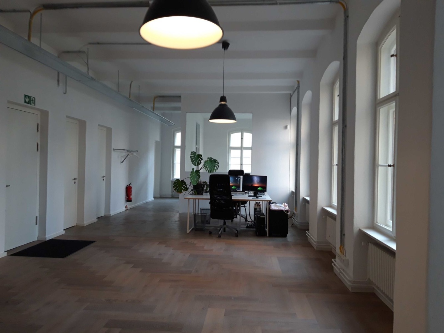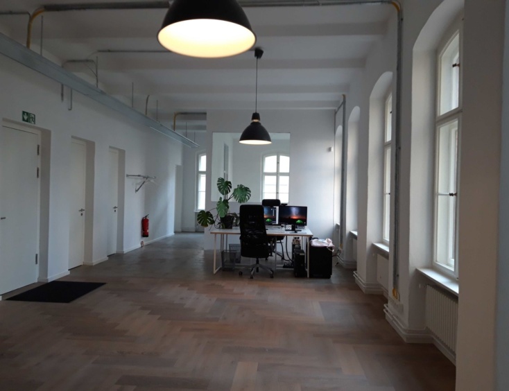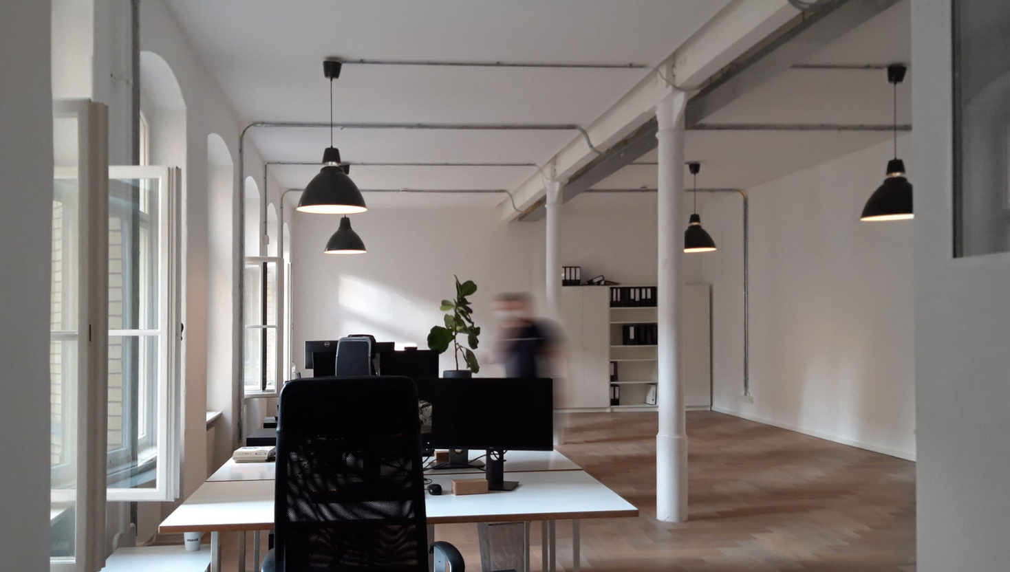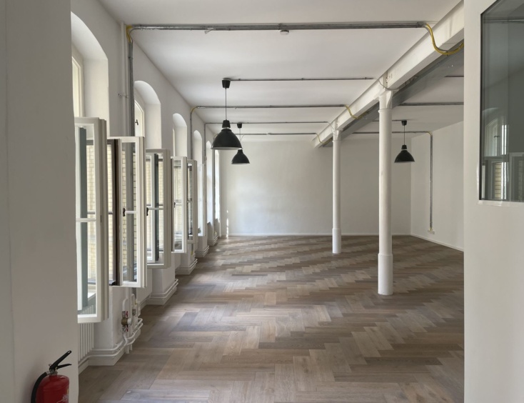 Im Fabrikgebäude Neue West bezog das Team ein offenes Loft, das erst vor wenigen Jahren von uns liebevoll restauriert wurde und mit Eichenparkett und stählernen Stützen die die Decken tragen, begeistert.