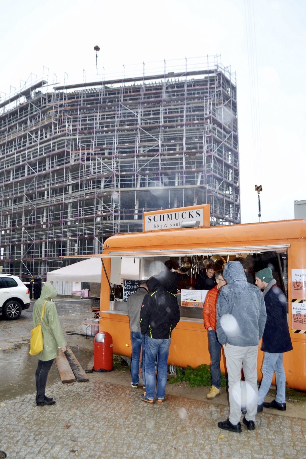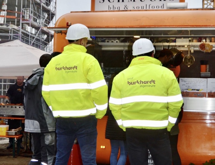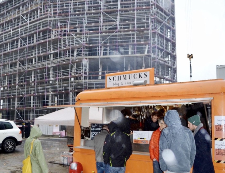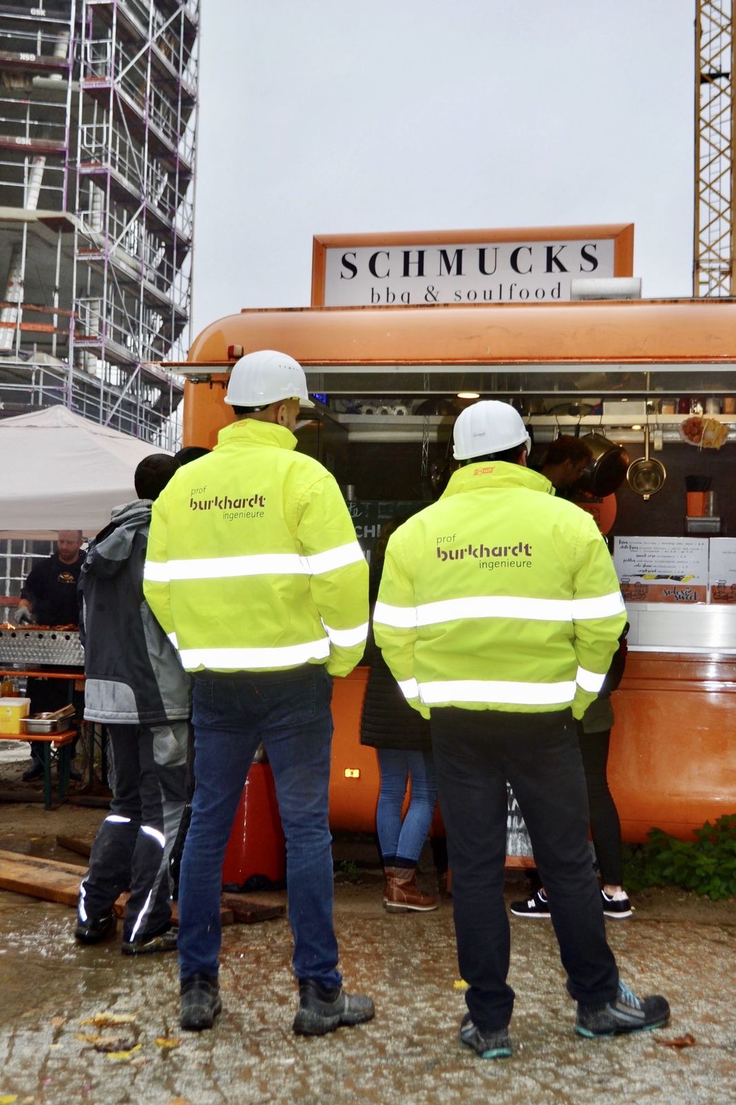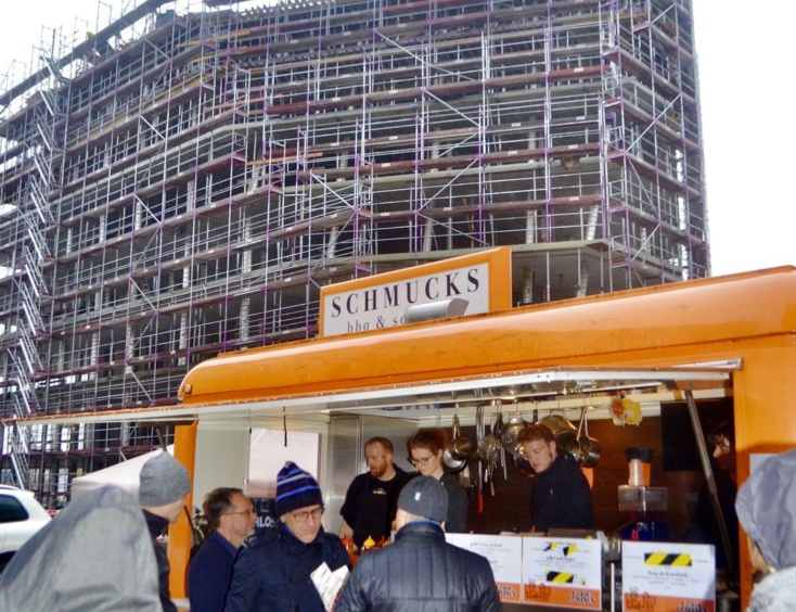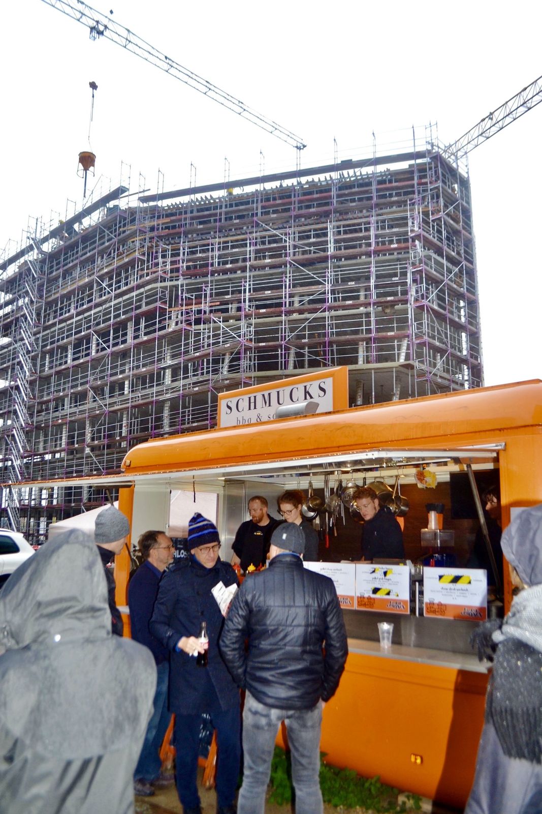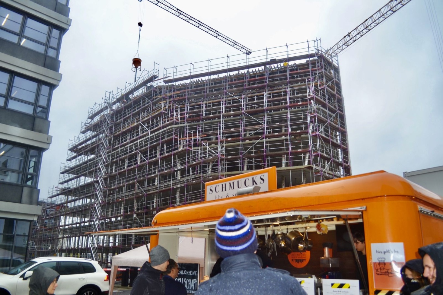 Am vergangenen Freitag fand ein ungewöhnliches Richtfest auf der Baustelle THE TERRACE statt. Corona-bedingt gab es keine Feier im üblichen Sinne. Die ANH hat stattdessen alle Bauarbeiter und Planungs- und Projektbeteiligte, unter Einhaltung aller Hygienemaßnahmen, auf einen Imbiss bei Schmucks BBQ & Soulfood Food Truck an der Baustelle eingeladen. Die erste Bauphase ist somit abgeschlossen. Die sieben Geschosse sind fertiggestellt und das Gebäude ruht nun auf insgesamt 245 Sichtbetonrundstützen. Jetzt beginnt die zweite Bauphase mit den Innenausbauten und den Fassadenarbeiten, wobei 2.700m² Glass und 1 km Geländer verbaut werden.