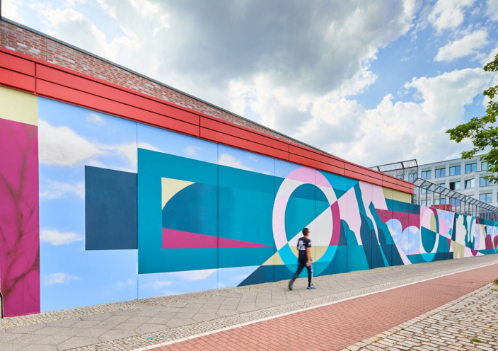 Mural für BLANKENSTEINBERLIN – Eine Seite des Centers in der Berliner Hermann-Blankenstein-Straße war bisher als einfache Fläche in Sichtbeton gestaltet. Mit Roberto Rivadeneira konnte ANH Hausbesitz einen …