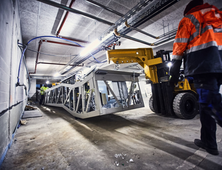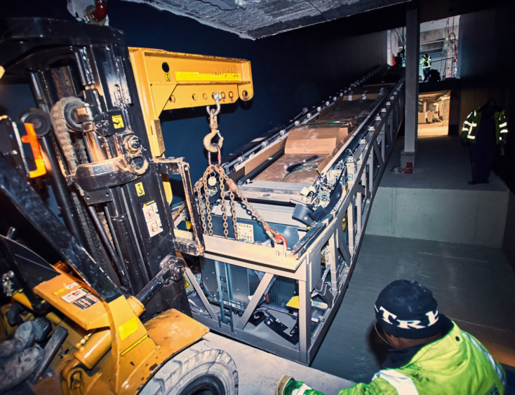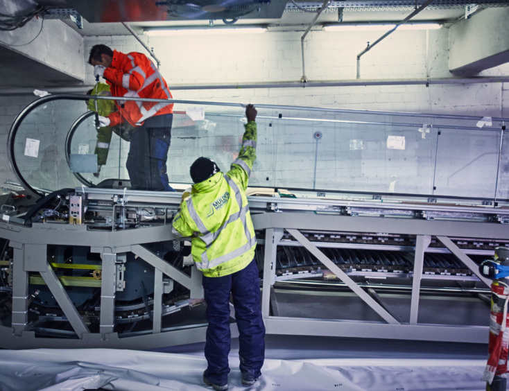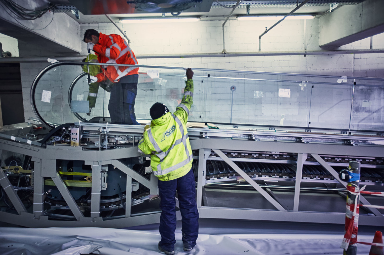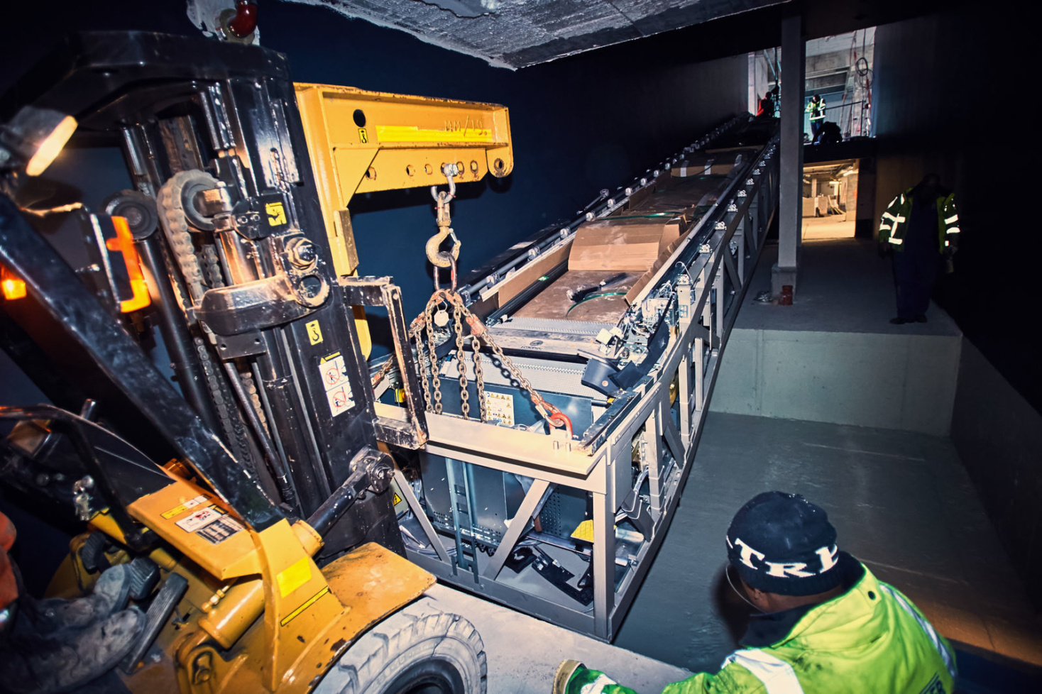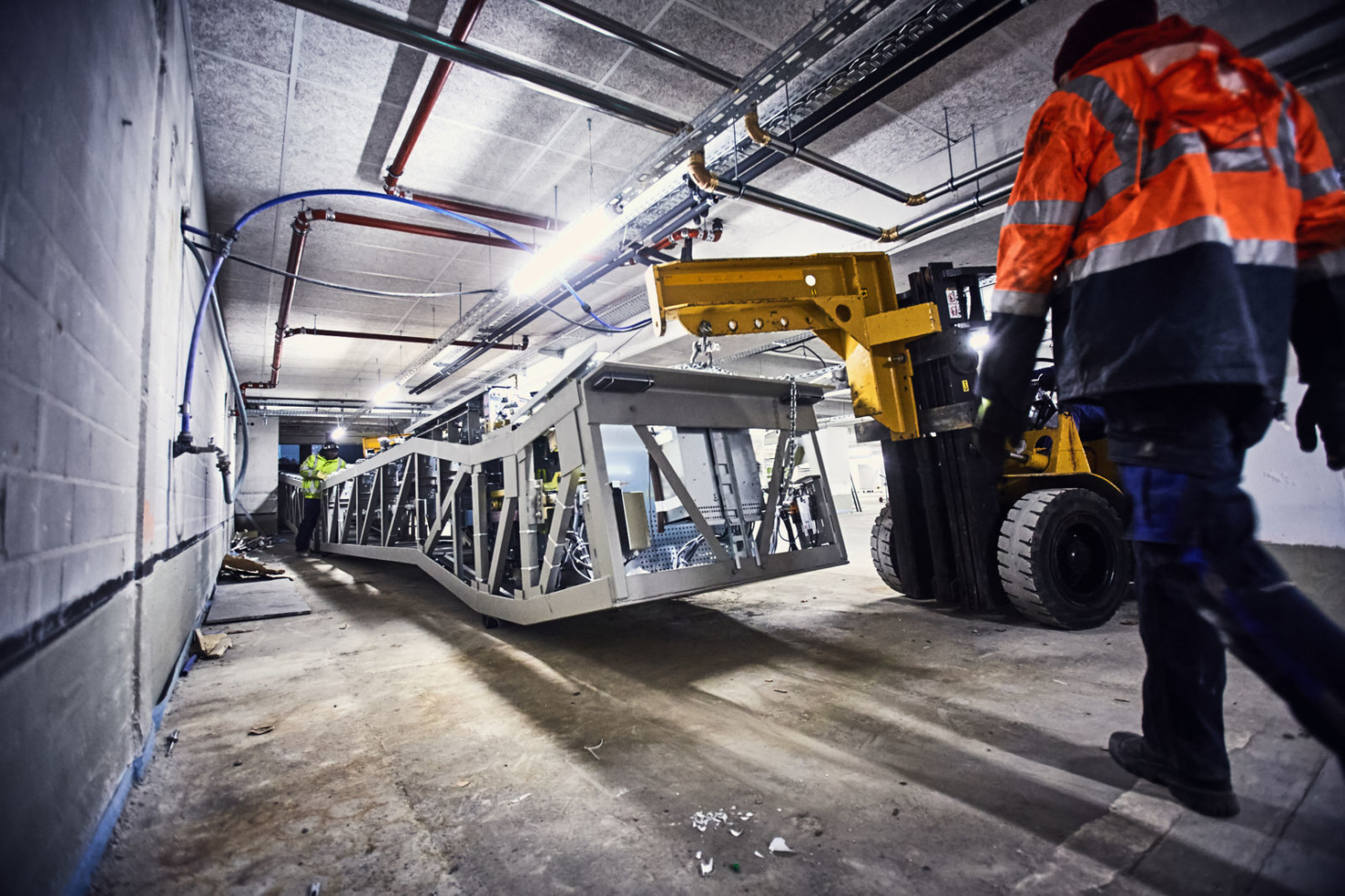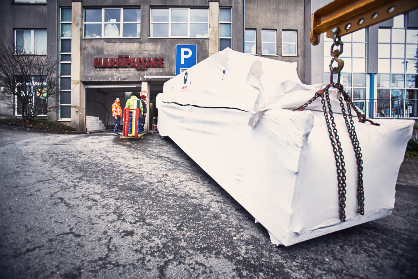 Die Fahrsteigen mussten zunächst behutsam durch die Tiefgarageneinfahrt bugsiert werden. Anschließend mussten die Balustradenscheiben demontiert werden, um die maximale Höhe der Tiefgarage von 2,05 m nicht zu überschreiten. Danach konnten die einzelnen Fahrsteigteile an die Stelle transportiert werden, an der diese verbaut werden sollten. Dieser zentimetergenaue Transport erfolgte durch spezielle Gabelstapler, die extra für einen solchen Schwerlasttransport ausgelegt sind. Der Einbau durch die Monteure der Firma Schindler dauerte den gesamten Dienstag.