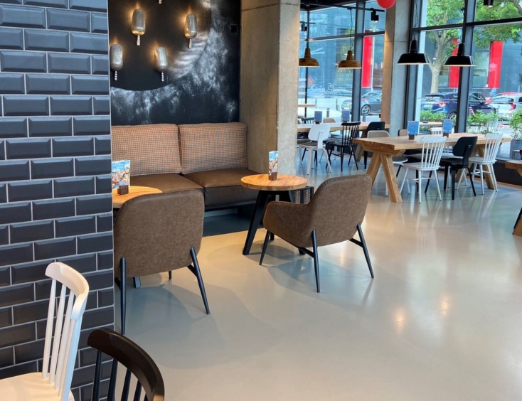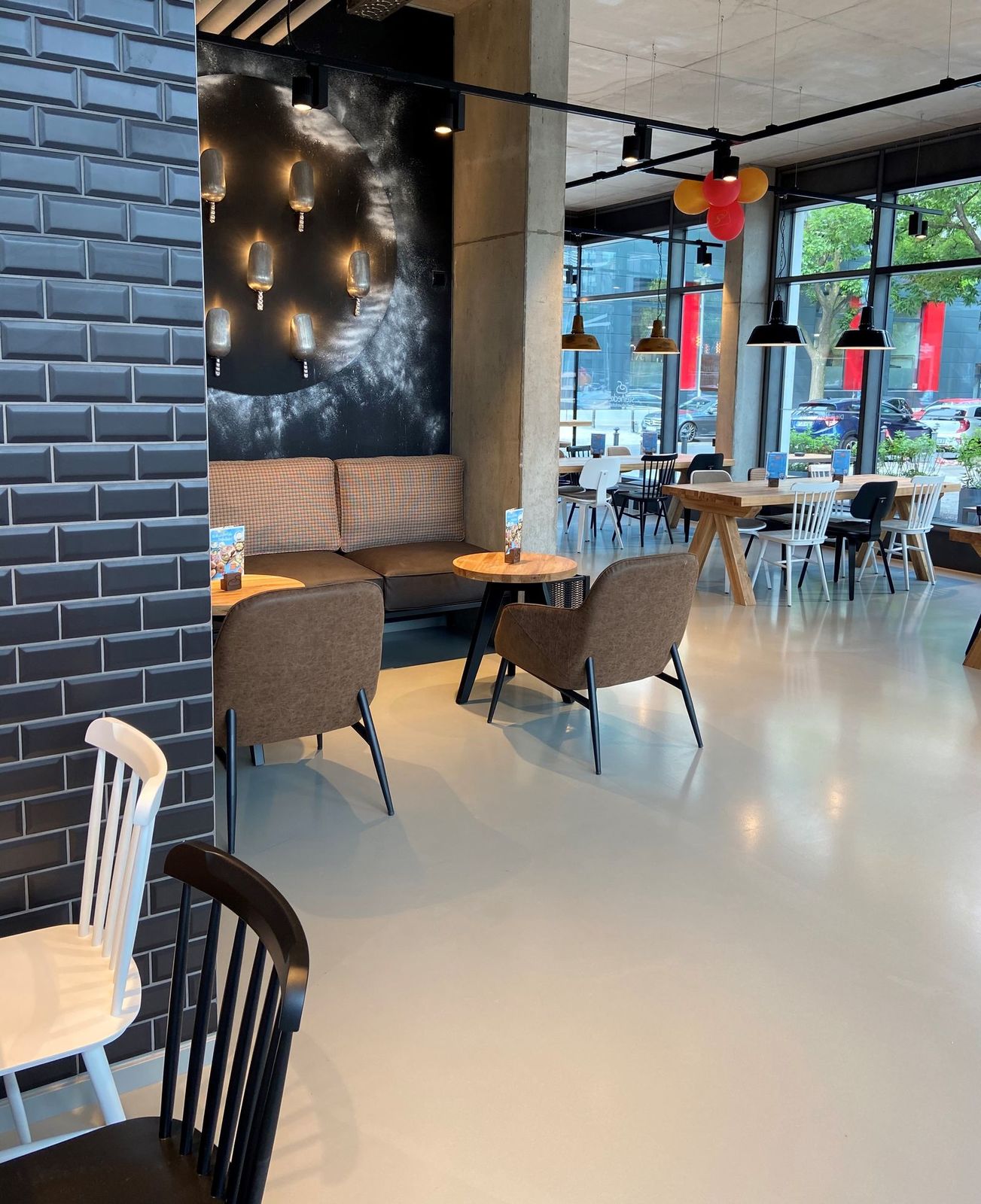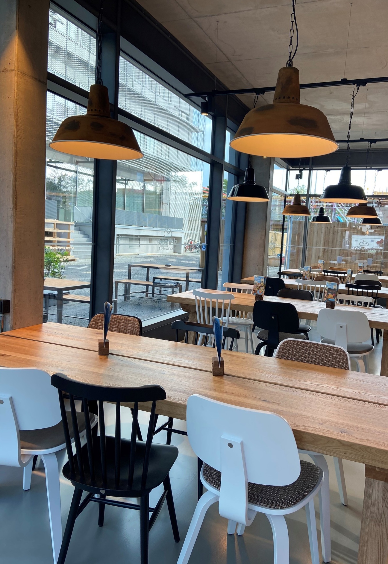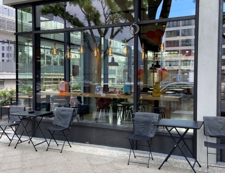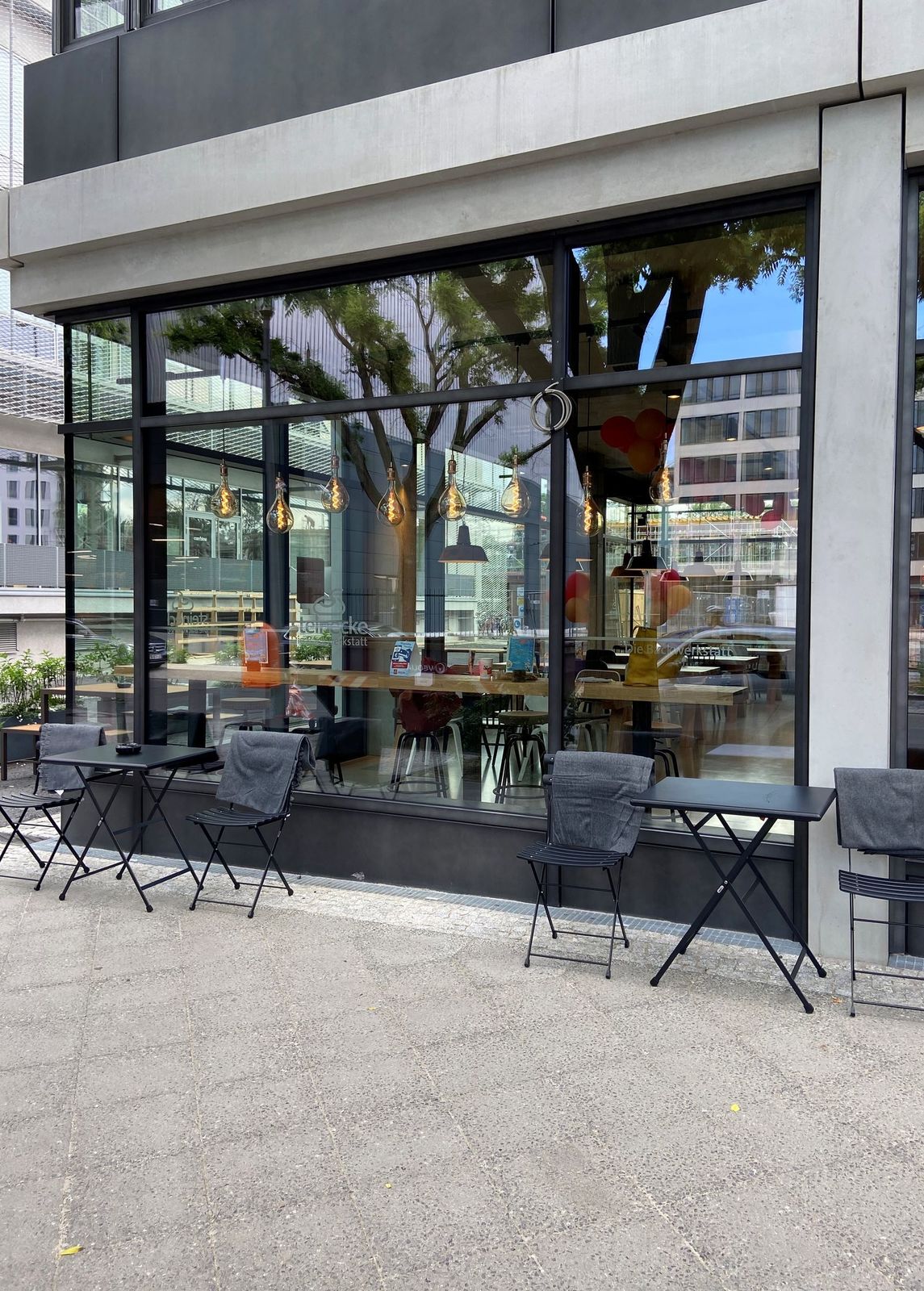 Mit einem auf das visuelle Gebäudekonzept abgestimmten Shopdesign belebt die erste vermietete Ladenfläche im THE KNEE am Charlottenburger Spreeufer das Quartier und bietet an sieben Tagen in der Woche Frühstück und kleine Gerichte von früh bis spät.