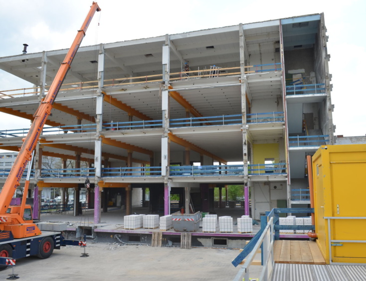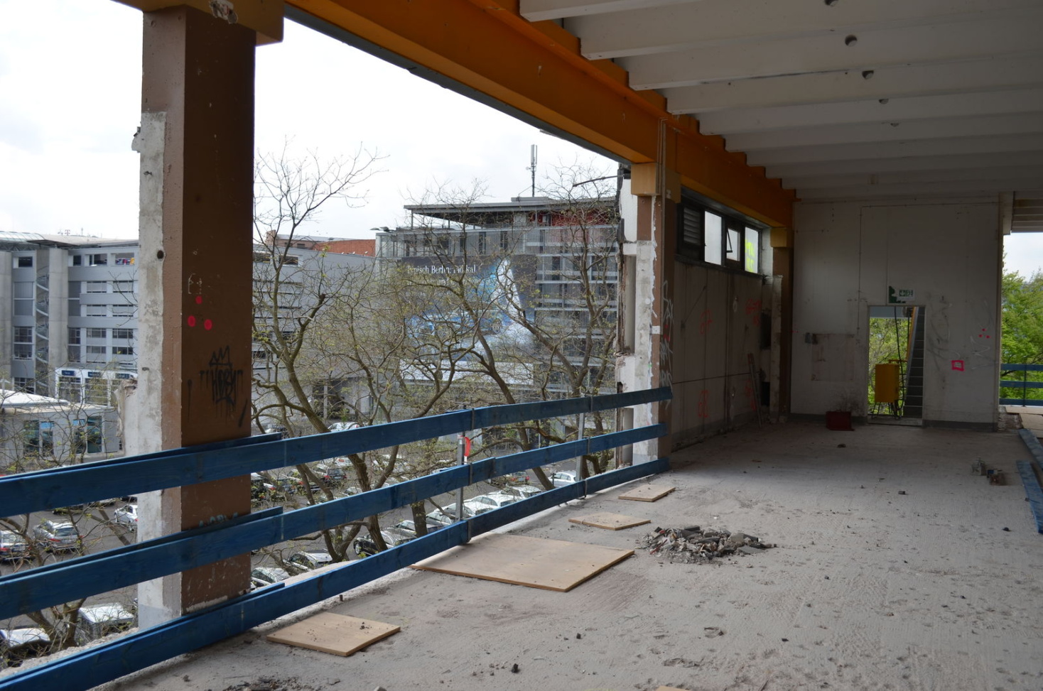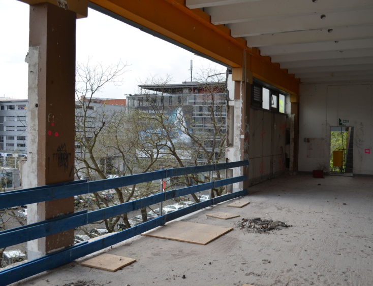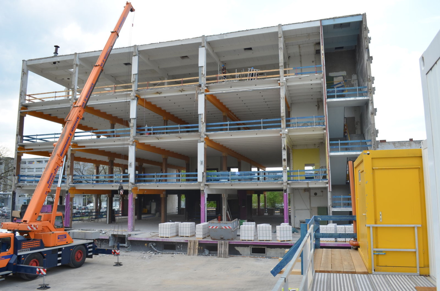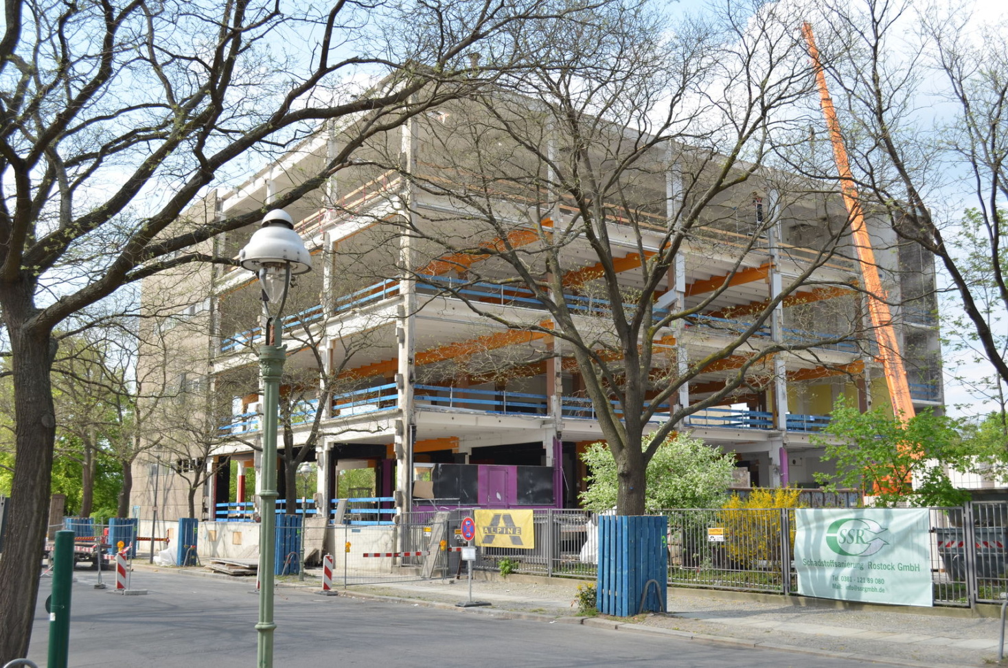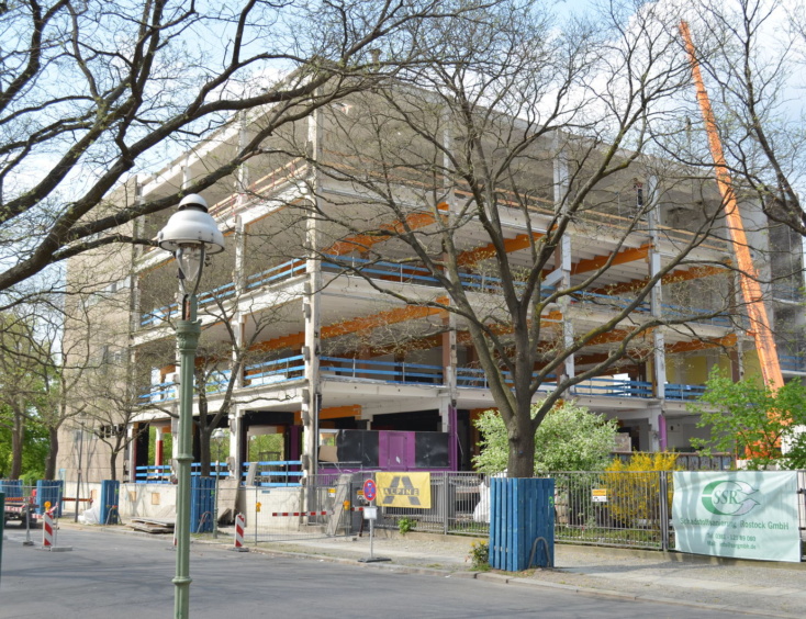 Die Bauarbeiten auf dem Spreegrundstück sind in vollem Gang. Das Gebäude lässt seine Hüllen fallen und beeindruckt durch eine imposante Größe und die spektakulären Durchblicke. Der Neubau des Staffelgeschosses wird ab August erfolgen.