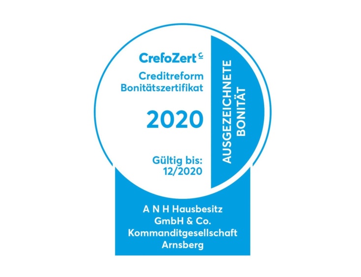 Die ANH Hausbesitz GmbH & Co. Kommanditgesellschaft weist ein ausgezeichnetes Bilanzrating sowie mit einem Bonitätsindex von 101 eine hervorragende Bonität auf und erfüllt damit alle Zertifizierungskriterien für das CrefoZert.